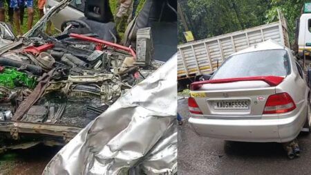 ಸುಳ್ಯ: ಲಾರಿ ಮತ್ತು ಕಾರಿನ ನಡುವೆ ಭೀಕರ ಅಪಘಾತ ಸಂಭವಿಸಿ ಕಾರಿನಲ್ಲಿದ್ದ ನಾಲ್ವರೂ ಸಾವನ್ನಪ್ಪಿರುವ ಘಟನೆ ಸಂಪಾಜೆಯ ಕೊಯನಾಡಿನಲ್ಲಿ ನಡೆದಿದೆ. ಇಬ್ಬರು ಸ್ಥಳದಲ್ಲೇ ಸಾವನ್ನಪ್ಪಿದ್ದರೆ ಮತ್ತಿಬ್ಬರು ಆಸ್ಪತ್ರೆಗೆ…