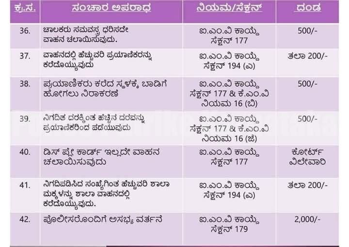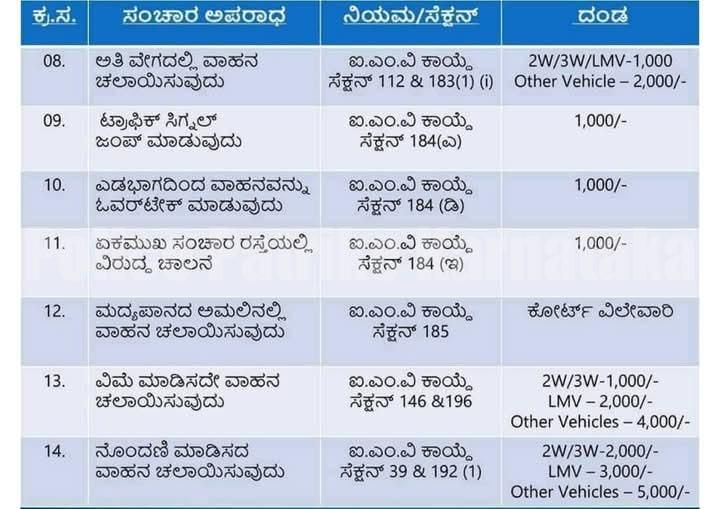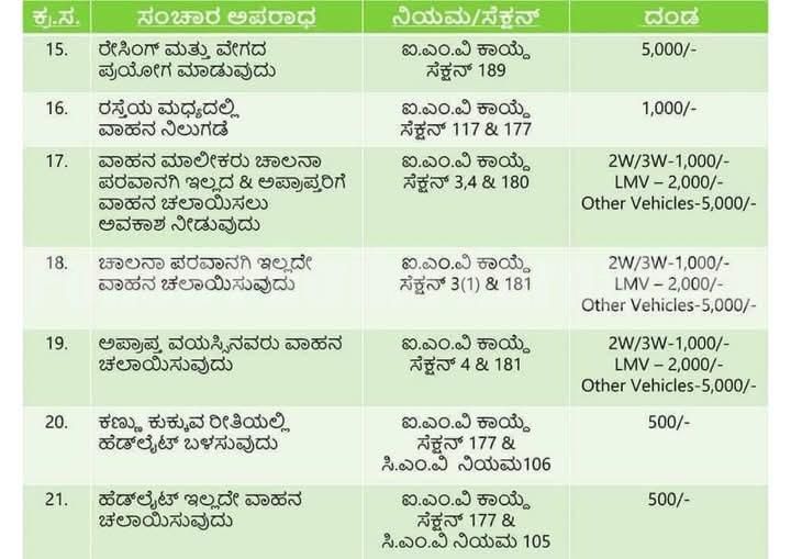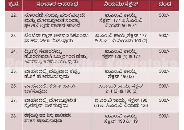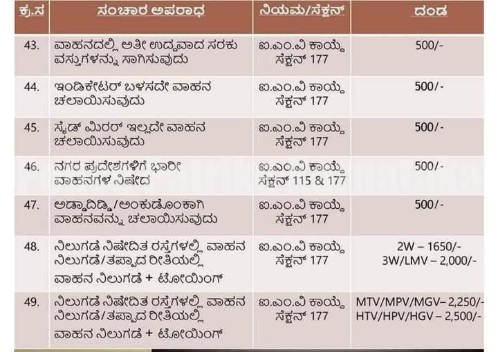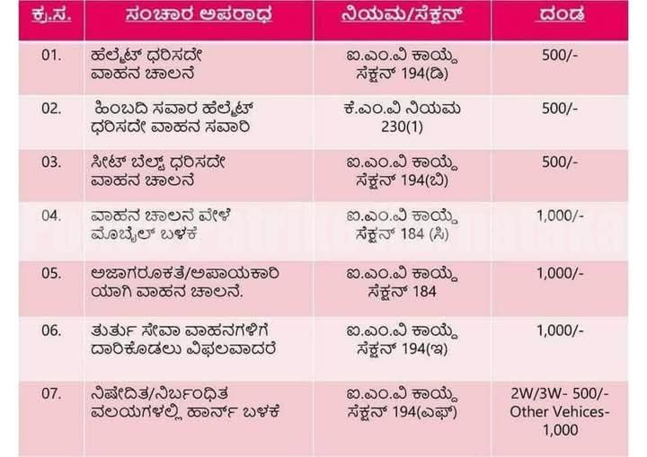 ಐ.ಎಂ.ವಿ ಕಾಯ್ದೆ ಸೆಕ್ಷನ್ 194(ಎಫ್) 2W/3W-500/- ಇತರೆ ವಾಹನಗಳು- 1,000 ರೂ. ದಂಡ