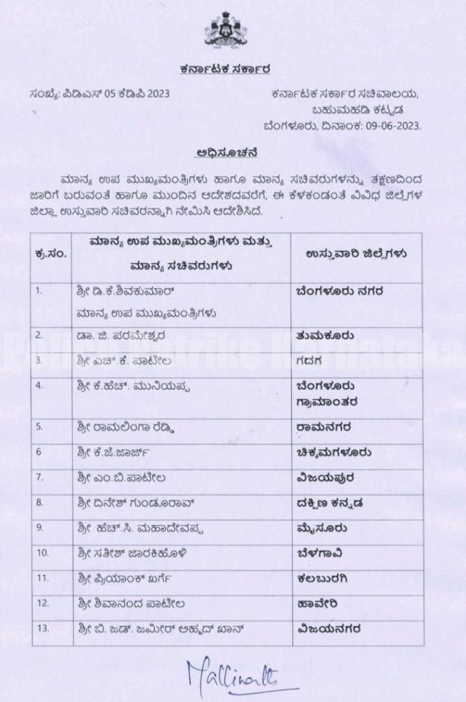 ಬೆಂಗಳೂರು;ನೂತನ ಸರಕಾರದಿಂದ ಜಿಲ್ಲಾ ಉಸ್ತುವಾರಿ ಸಚಿವರ ನೇಮಕ ಮಾಡಲಾಗಿದೆ.