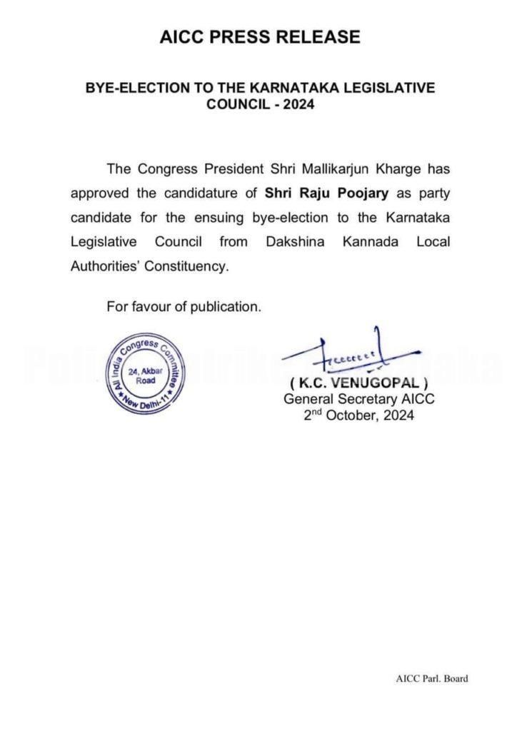 ರಾಜು ಪೂಜಾರಿ ಅವರನ್ನು ಅಭ್ಯರ್ಥಿಯನ್ನಾಗಿ ಆಯ್ಕೆಗೆ ಎಐಸಿಸಿ ಅಧ್ಯಕ್ಷ ಮಲ್ಲಿಕಾರ್ಜುನ ಖರ್ಗೆ ಅವರು ಅನುಮೋದನೆ ನೀಡಿರುವುದಾಗಿ ಎಐಸಿಸಿ ಪ್ರಧಾನ ಕಾರ್ಯದರ್ಶಿ ಕೆ.ಸಿ.ವೇಣುಗೋಪಾಲ್ ಪ್ರಕಟನೆಯಲ್ಲಿ ತಿಳಿಸಿದ್ದಾರೆ. ಈಗಾಗಲೇ ಬಿಜೆಪಿ ಸಹ ತನ್ನ ಅಭ್ಯರ್ಥಿಯನ್ನು ಕಿಶೋರ್ ಕುಮಾರ್ ಪುತ್ತೂರ್ಗೆ ಟಿಕೆಟ್ ನೀಡಲಾಗಿದ್ದು, ಇದೇ ಅಕ್ಟೋಬರ್ 21ರಂದು ದಕ್ಷಿಣ ಕನ್ನಡ ಹಾಗೂ ಉಡುಪಿ ಜಿಲ್ಲೆಯ ಸ್ಥಳೀಯ ಸಂಸ್ಥೆಗಳನ್ನು ಪ್ರತಿನಿಧಿಸುವ ವಿಧಾನ ಪರಿಷತ್ ಸ್ಥಾನದ ಮರು ಚುನಾವಣೆ ಅ.21 ರಂದು ಉಪಚುನಾವಣೆ ನಡೆಯಲಿದೆ.
