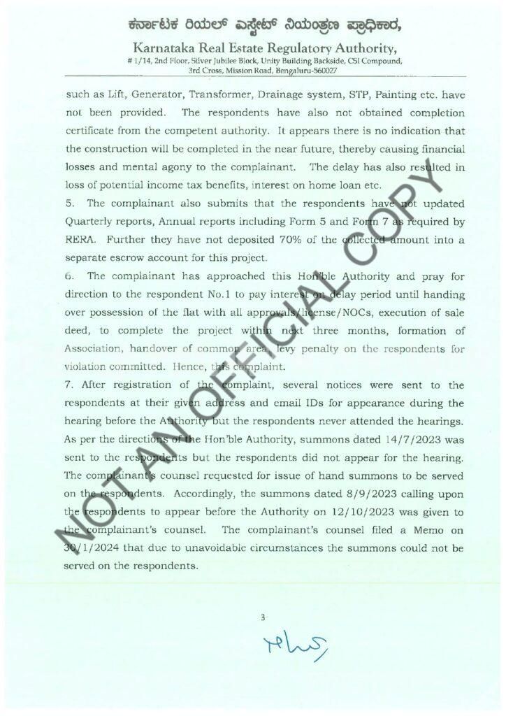 ಈ ಬಗ್ಗೆ ಮನನೊಂದ 5 ಮಂದಿ ಗ್ರಾಹಕರು ಸೂಕ್ತದ ದಾಖಲೆಗಳೊಂದಿಗೆ ರೇರದ ಮೊರೆ ಹೋದರು ಈ ಬಗ್ಗೆ ವಿಚಾರಣೆ ನಡೆಸಿದ ರೇರ ಮೂವರು ಅರ್ಜಿದಾರರಾದ ಹರ್ಷ, ದಿನೇಶ್ ರವರಿಗೆ ರೂ 9,07,691, ಜೀತನ್ ದಿಕ್ಕುನ್ನ ರವರಿಗೆ ರೂ 10,07,939 ಹಾಗೂ ಕೃಷ್ಣರಾಜ ಸಾಲಿಯಾನ್ ರವರಿಗೆ ರೂ 651614 ಪರಿಹಾರವನ್ನು 60 ದಿನಗಳ ಒಳಗೆ ಪಾವತಿಸುವಂತೆ ಮತ್ತು ಕಟ್ಟಡವನ್ನು 60 ದಿನ ಒಳಗೆ ಪೂರ್ಣಗೊಳಿಸುವಂತೆ ಆದೇಶಿಸಿದೆ. ಇನ್ನು ಇಬ್ಬರು ಅರ್ಜಿದಾರರಾದ ಸುಪ್ರೀತ್ ಹಾಗೂ ಅಭಿಷೇಕ್ ಪೂಜಾರಿಯವರ ಅರ್ಜಿ ವಿಚಾರಣೆ ಹಂತದಲ್ಲಿದ್ದು ಶೀಘ್ರದಲ್ಲಿ ತೀರ್ಪು ಹೊರಬೀಳುವ ಸಾಧ್ಯತೆ ಇದೆ. ರೇರದ ಈ ಆದೇಶ ಮಂಗಳೂರು ನಗರದಲ್ಲಿ ಮೊದಲ ಪ್ರಕರಣ ಎನ್ನಲಾಗಿದೆ.