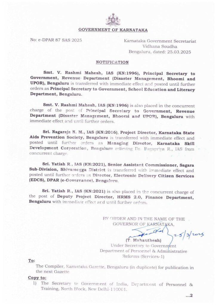 ಕರ್ನಾಟಕ ಆಡಳಿತ ಸೇವೆಗೆ ಸೇರಿದ ಈ ಕೆಳಕಂಡ ಅಧಿಕಾರಿಗಳನ್ನು ಸಾರ್ವಜನಿಕ ಹಾಗೂ ಆಡಳಿತಾತ್ಮಕ ಹಿತದೃಷ್ಟಿಯಿಂದ ಈ ಕೂಡಲೇ ಜಾರಿಗೆ ಬರುವಂತೆ ಹಾಗೂ ಮುಂದಿನ ಆದೇಶದವರೆಗೆ ವರ್ಗಾವಣೆ ಮಾಡಿ ವಿವಿಧ ಹುದ್ದೆಗಳಿಗೆ ನಿಯೋಜನೆ ಮಾಡಿ ಆದೇಶ ಹೊರಡಿಸಲಾಗಿದೆ.