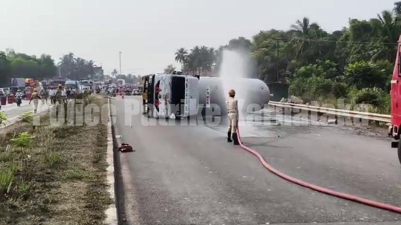 ರಾಷ್ಟ್ರೀಯ ಹೆದ್ದಾರಿಯಲ್ಲಿ ಕಾಮಗಾರಿ ನಡೆಯುತ್ತಿರುವ ಸ್ಥಳದಲ್ಲೇ ಟ್ಯಾಂಕರ್ ನಿಯಂತ್ರಣ ತಪ್ಪಿ ಮಗುಚಿ ಬಿದ್ದಿರುವುದಾಗಿ ತಿಳಿದು ಬಂದಿದೆ. ಘಟನೆಯ ಬಳಿಕ ಸ್ಥಳದಲ್ಲಿ ಕೆಲಕಾಲ ಆತಂಕದ ವಾತಾವರಣ ನಿರ್ಮಾಣವಾಗಿತ್ತು.‌ಸುದ್ದಿ ತಿಳಿದ ತಕ್ಷಣ ಅಗ್ನಿಶಾಮಕ ದಳದ ಸಿಬ್ಬಂದಿಗಳು ಸ್ಥಳಕ್ಕೆ ಧಾವಿಸಿ ಟ್ಯಾಂಕರ್‌ನಲ್ಲಿ ಗ್ಯಾಸ್ ಸೋರಿಕೆ ಇದೆಯೇ ಎಂಬುದರ ಬಗ್ಗೆ ಪರಿಶೀಲನೆ ನಡೆಸಿದರು. ಯಾವುದೇ ಅಪಾಯ ಸಂಭವಿಸದಂತೆ ಮುನ್ನೆಚ್ಚರಿಕಾ ಕ್ರಮವಾಗಿ ಟ್ಯಾಂಕ‌ರ್ ಮೇಲೆ ನೀರು ಹಾಯಿಸುವ ಮೂಲಕ ಅಗ್ನಿಶಾಮಕ ಸಿಬ್ಬಂದಿಗಳು ಕಾರ್ಯಾಚರಣೆ ನಡೆಸಿದರು.